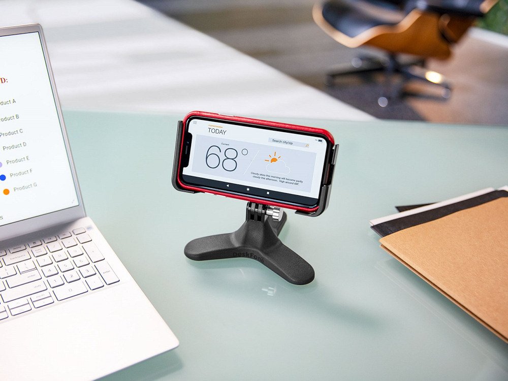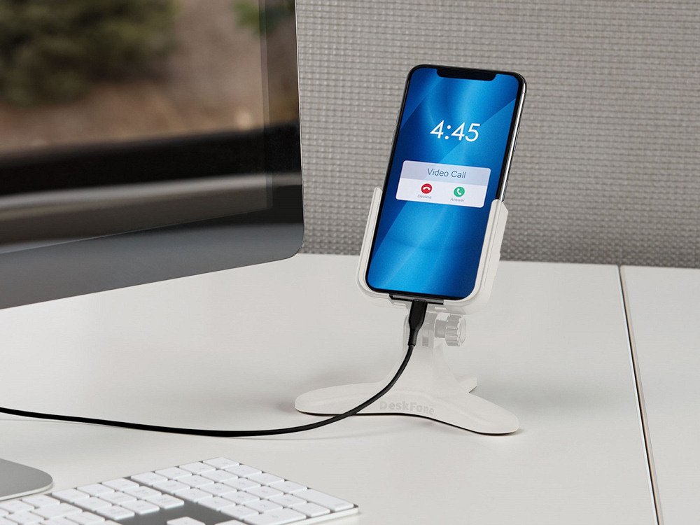 DeskFone™ is a mobile phone holder that conveniently sits right on your desktop, tabletop or kitchen counter top. The fully adjustable phone holder allows you to set the perfect viewing angle, making it ideal for video calls/chats, watching a video or reading emails and texts. It holds your phone up and keeps it visible, so it won't get lost on your desk! DeskFone's tripod design creates a stable stance on your desk, and the holder won't wobble or shift on its own.
