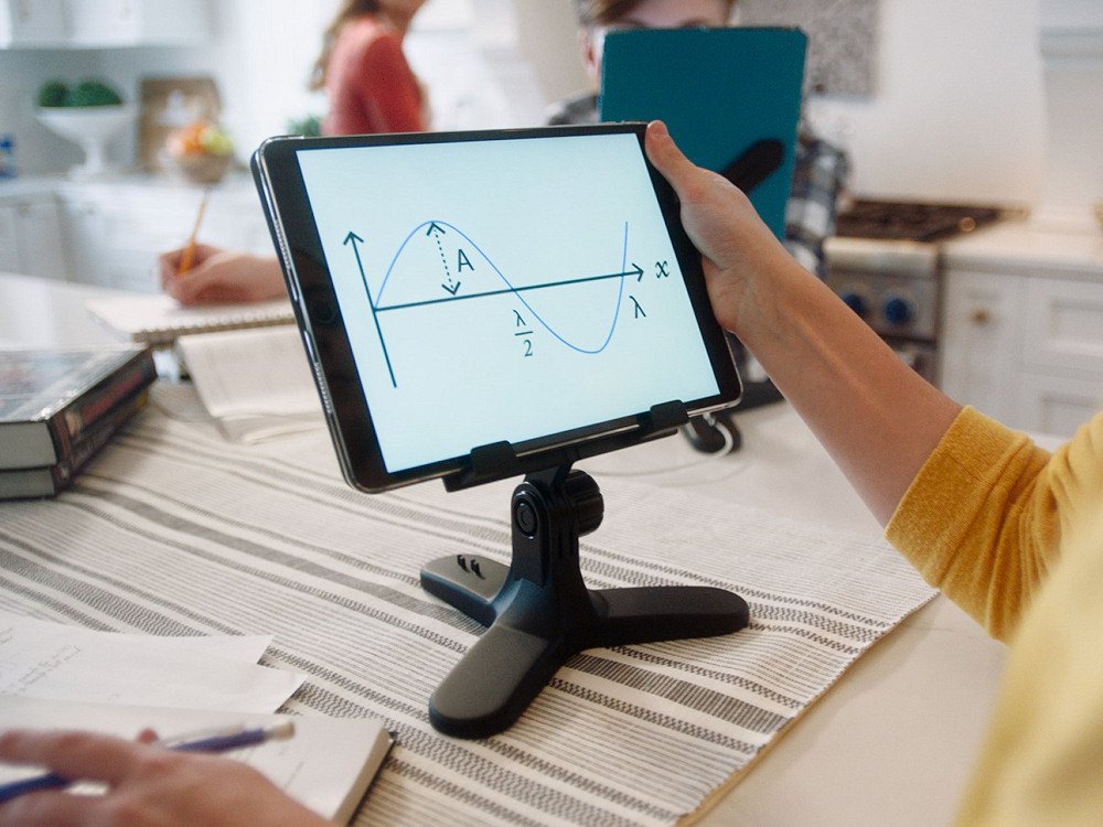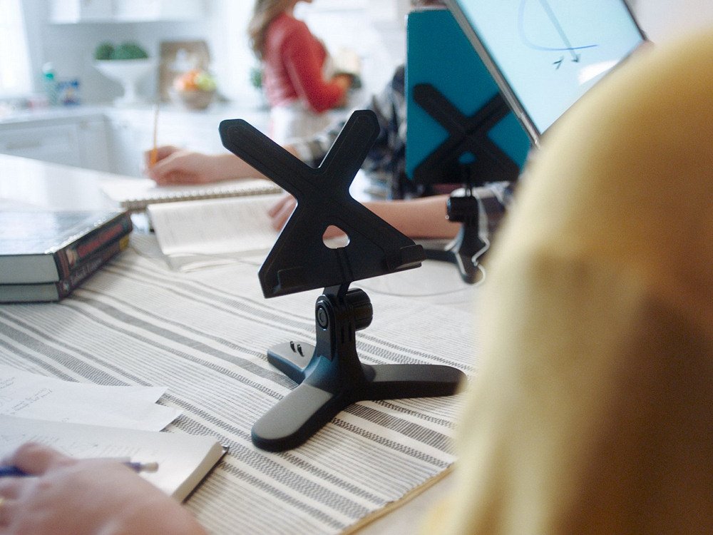 Tablet Holder’s tripod base features anti-skid rubber feet and a weight to keep it stable. Anti-slip material on both the holder face and the holder hooks ensure that your tablet stays safe and sound, no matter its size. Works for both portrait and landscape viewing, and with or without a charging cable. A unique cable weave on the rear foot secures your charging cable while in use.